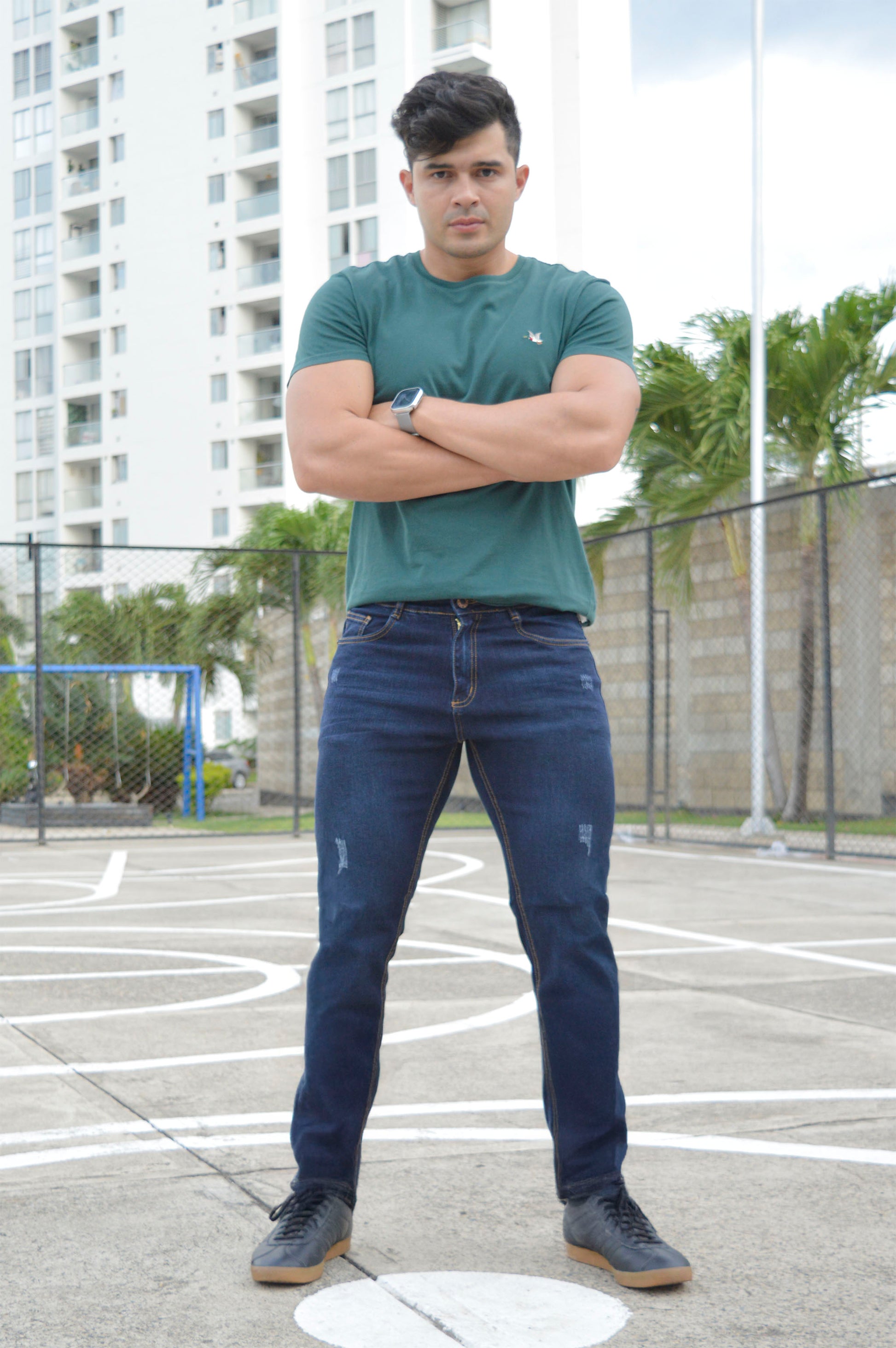 Confeccionado con tela denim resistente y elástica, que te da la libertad de moverte y soporta el uso diario. Incluye desgarres sutiles para un toque moderno y actual.